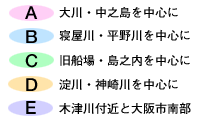 今橋(中央区)、小橋(天王寺区、生野区)、高麗橋(中央区)、心斎橋(中央区)、太子橋(旭区)、鶴見橋(西成区)、天神橋(北区)、天満橋(北区、中央区)、長橋(西成区)、日本橋(中央区、浪速区)、農人橋(中央区)、本町橋(中央区)