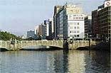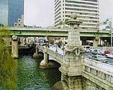 最初の橋は、江戸暗代の豪商 淀屋が私財を投じて架けたと伝えられる。現在の橋は昭和10年に御堂筋の建設に伴い架けられたコンクリート・アーチ橋。中之島を挟んで北側にある大江橋と同じ石造りの重厚な意匠は、士木構造物には珍しく懸賞募集が行われ、その最優秀作品をもとに設計されたもの。橋の南詰西側には宮本又次氏の碑文を刻んだ「淀屋の碑」が、北詰の日本銀行正面には「淀屋橋・大江橋・欄干復元」の碑が据えられている。